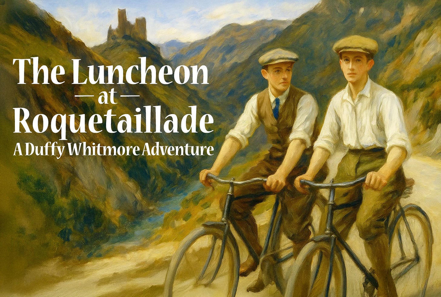 Roquetaillade lay eight miles east — a manageable stretch by bicycle, or a pilgrimage on foot should the bicycles continue their policy of indifference. The road climbed steadily through the vineyards, each bend offering a postcard of the last one. Trevor rode ahead in a posture of revelation, the wind making an icon of his hair.