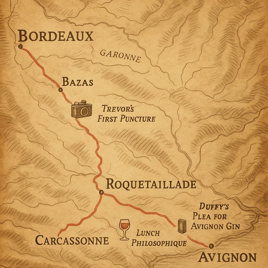We left Bordeaux the next morning at the hour favoured by milkmen and moralists. The city still yawned itself awake as we rattled across the bridge, our tyres emitting a faint hymn of purpose. Trevor led with the confidence of a general whose map is upside down; I followed at a journalist’s pace, which is to say, far enough behind to preserve objectivity.